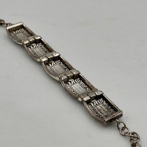 The slightly curved, hinged links provide a flexible and comfortable fit. A secure lobster clasp with extender chain allows the bracelet to adjust from 7 to 8 inches. Light surface wear on the silver plate gives the bracelet a vintage patina, enhancing its charm and character.