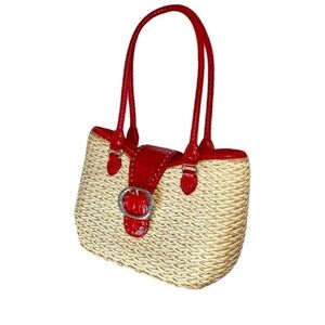 Vintage Brighton Straw Shoulder Bag 2000s Red Patent Leather Silver Hardware Purse