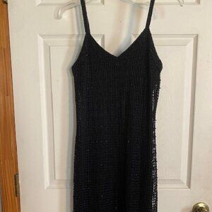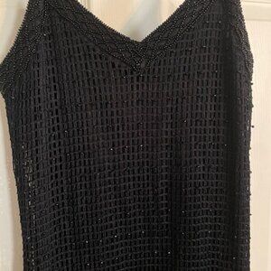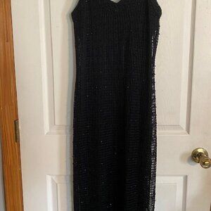 Classic Vintage 80's beaded Brilliante evening gown in excellent condition, black, dress is a netting with beads sewn all over on the netting, with a full legth lining, beaded trim around top and shoulder straps, small slit in back accented by beaded trim. Classis slim straight line fit, fits more like a small, measurements are: chest 33 in, waist 33 in, full length to the floor