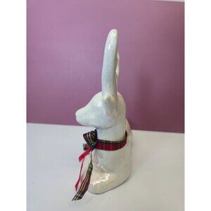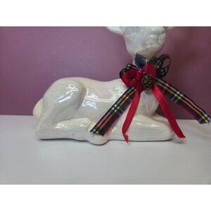 This vintage ceramic deer figure features an elegant iridescent glaze that enhances its festive appeal. Adorned with a plaid bow and pinecone accent, it's a charming addition to holiday decor. Display it on a mantel or shelf to create a warm, inviting atmosphere in your home.