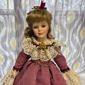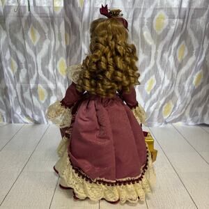 Beautiful Brinn's Limited edition Holiday Victorian mauve taffeta dress trimmed with ivory lace. Blonde curly hair and blue eyes. Gold holiday packages. She is in very good condition. Please see pictures for measurements and details.