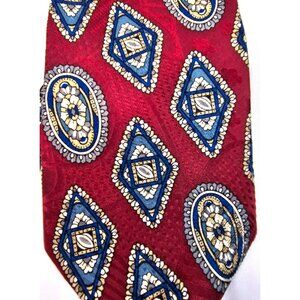 A classic silk tie featuring a vibrant red and blue geometric and floral design. Made in the USA with imported fabric, ideal for formal wear.