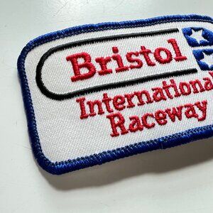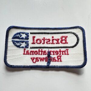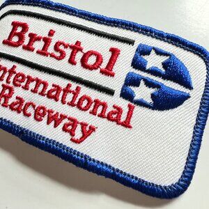 Vintage Bristol International Raceway racing patch in red, white and blue. Approx 4" long x 2" tall. Embroidered design, good condition.