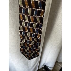 The Vintage Britches of Georgetowne Silk Tie is a classic accessory for men with a multicolor geometric mid-century pattern. Made from 100% silk, this designer tie features a vintage logo accent and a retro theme. Handmade and adjustable, this tie exudes a timeless American and collegiate style, perfect for adding a touch of sophistication to any outfit. With its one size fits all design, this rare tie is a must-have for those who appreciate vintage fashion with a modern twist.