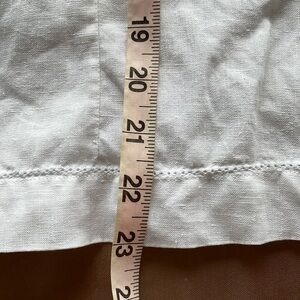 Vintage British Khaki Bright White Linen Button Up Top. Size tag has been removed. Measured and wears like a medium. Crocheted seam details Straight hem. 3/4 Sleeves. Approximate measurements in photos. Stain on sleeve that I haven’t tried to remove so it may come out- See photos. Heavier linen.