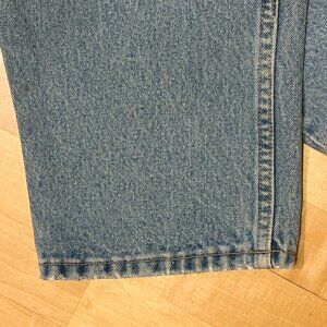 The size tag states 34x30 - I measured the waist and seam to seam I come up with 16.5" seam to seam, and the inseam at 29". Given age and being 100% cotton, I assume they have incurred shrinkage. These high waisted pants have very wide legs, which are a current fashion trend. Minor wear at top of inner thigh (see photo), and at on hem edges (again, see photos). All are minimal (pants are roughly 40 years old), and do not negatively affect the look or wearability.