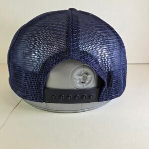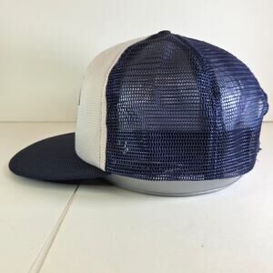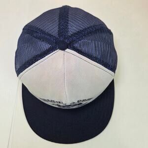 Authentic vintage Broken Arrow Resort trucker hat with a bold fishing graphic on the foam front. Features a navy mesh back with snap closure and a green underbrim. Classic Adjust-A-Tab, Made in USA label. Foam has begun to deteriorate (foam rot), and there is some discoloration inside and on the crown, consistent with age. Still holds display shape well and makes a great collectible piece for fishing or resort memorabilia collectors.