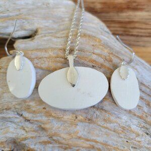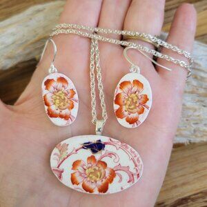 Beautiful pendant and earrings were hand cut and polished from a very old Teck Late Mayers Keeling & Co plate into jewelry set. Pendant is about 2 inches wide and earrings about 1.5" from top of silver plated hooks. Necklace comes on pretty 20" silver plated chain with lobster claw clasp. One of a kind, handmade.