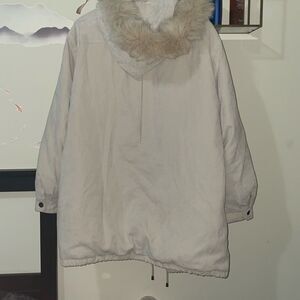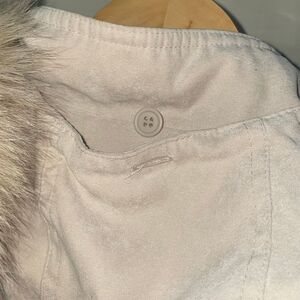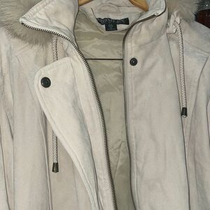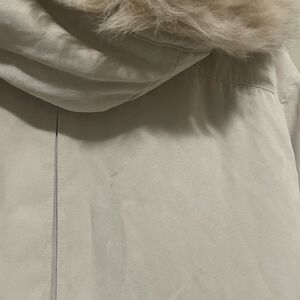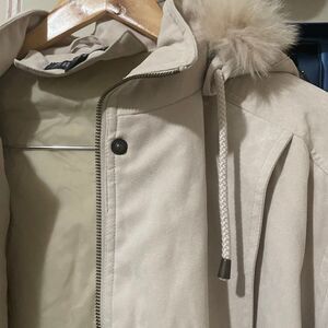 Bromley Sport women's beige coat with a removable hood and real fox fur trim hood. Two front pockets. Front zipper closure. Hood is completely removable.