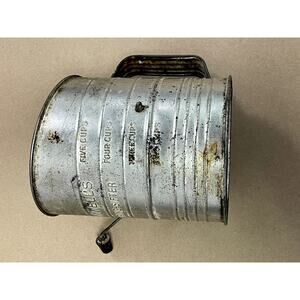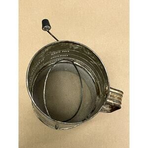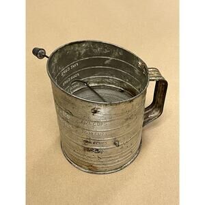 This vintage Bromwell's 5-cup flour sifter, likely from the 1940s. It is a kitchen tool used for aerating flour and removing clumps. Helpful information: