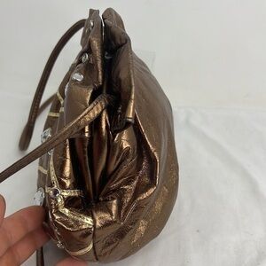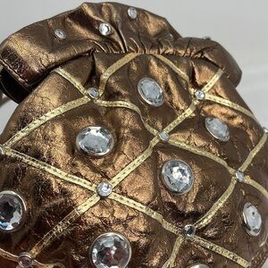 This is a beautiful Vintage Bronze Soft Leather Crystal Studded Top Frame Shoulder Bag Crossbody. Mix of bronze and gold leather and a mix of large and small crystals. Top frame snap and magnetic closure. Fully lined. Made by Isabel USA. Minor scuffs, nothing noticeable. 9” x 8” x 3.5” with a hidden 23” strap.