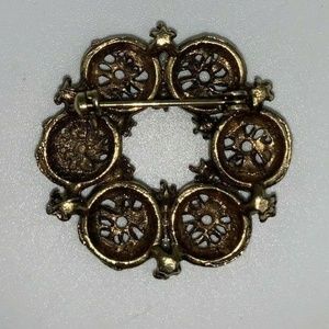 Pre-Owned in overall good condition Vintage 1.5" Goldtone Aurora Rhinestone Floral Pearl Wreath Pin. This pin is engraved floral design. It has small pearl detail! The pin is in the shape of a floral wreath! Perfect vintage piece for a gift idea! See pictures prior to purchase!