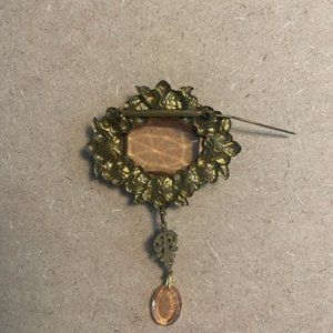 This is a beautiful find! the surrounding setting is a flower design with the large rose glass in the middle. The dangle is a beautiful ornate design with a rose glass and etched flourish. this is such a unique piece and currently not available in this exact style elsewhere