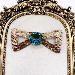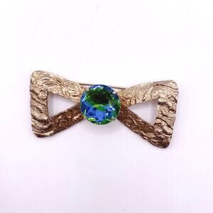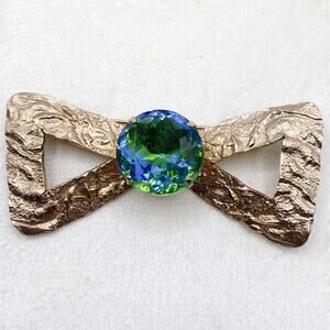 This vintage bow brooch from the 1960s features stunning Bohemian green and blue glass stones arranged in an elegant ribbon-shaped design. The stones display a beautiful mystic sapphire chrome tone, giving the brooch a vibrant, color-shifting sparkle that catches the light beautifully.