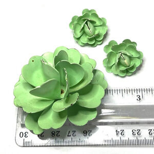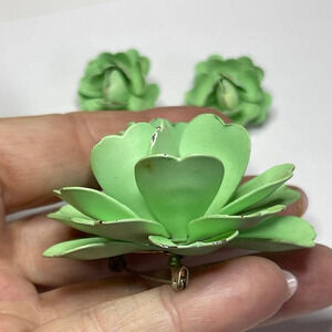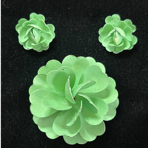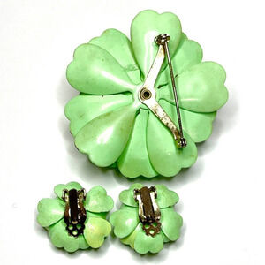 Vintage Brooch Clip Earrings Jewelry Set Green Enamel Flower AU04