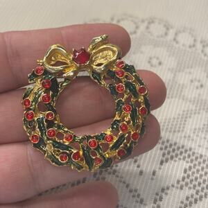 Vintage Brooch Costume Jewelry Christmas Enamel Wreath Pin Gold with Red Ruby