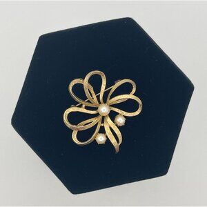 This vintage gold-tone flower brooch by unknown brand enhances any outfit with its 3 faux pearls and 2" size. A stylish accessory that adds a touch of elegance.