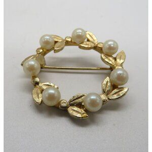 Vintage Brooch Gold Tone Leaf Imitation Pearl Wreath 1.25" Pin