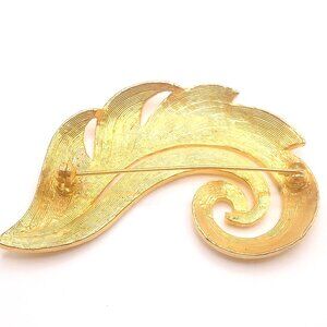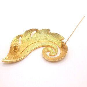 Vintage Brooch Hammered Curled Leaf Feather Design Gold Plated Metal Pin 3"