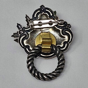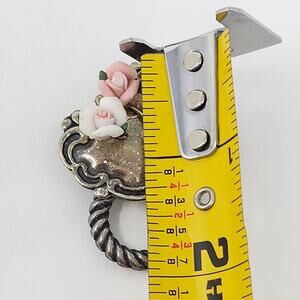 Beautiful vintage brooch in an aged silvertone that gives it a pewter-like finish has two dainty roses, one in pink and one in white, and a hummingbird taking a sip from one. Loop under the brooch can be simply decorative or can be used for hanging eyeglasses or sunglasses so you always have them handy. Measures approximately 2 inches long and is in good preowned condition.