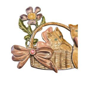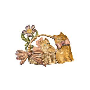 This brooch showcases a charming cat and kitten in a woven basket adorned with a flower and pink bow accents. A delightful vintage piece for accessory enthusiasts.