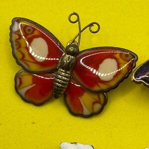 Vintage Brooch Lot Butterflies & White Flower Enameled. Adorable butterfly brooches are enamel and most likely made in Korea. Both in very good condition. Tiny white floral brooch shows some normal vintage wear with minor enamel chipping. Cute lot of vintage brooches. #42-A