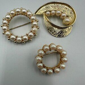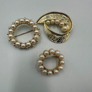 Vintage Brooch Lot Gold Tone Faux Pearl Wreath Leaf Circle Pins Set of 3