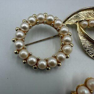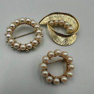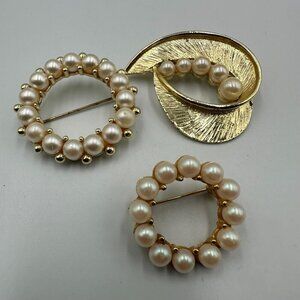 Vintage Brooch Lot Gold Tone Faux Pearl Circle Wreath Leaf Pins Set of 3