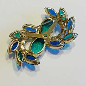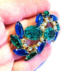 Vintage Brooch Mid Century Rhinestones Green Blue AB Prong Set Stones 50's 60's