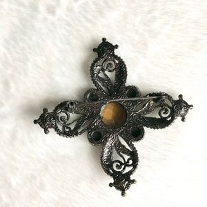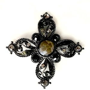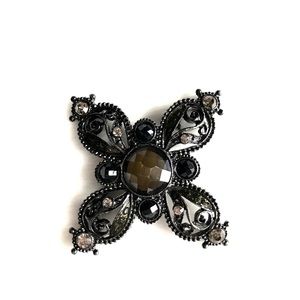 Black filagree with a faux smoked topaz center and 4 smaller faux smoked topaz on the tips. Very rich looking Brooch / Pin. Vintage.