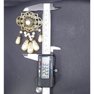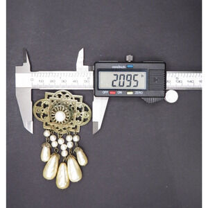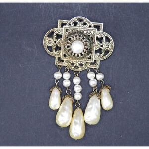 Vintage Brooch Pin Gold Tone Metal with Dangling Faux Oval And Round Pearls