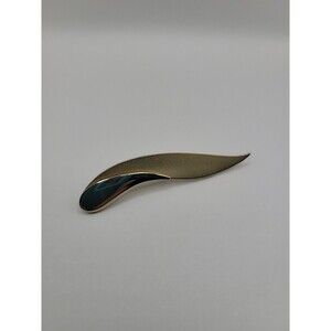 This vintage designer brooch pin features a gold tone two tone textured abstract design, perfect for special occasions like anniversaries or birthdays. The asymmetrical shape adds a unique touch to the piece, which is signed by the designer. Measuring 2 3/4 inches in length, this vintage jewelry item is a timeless beauty that can be worn with a variety of outfits to add a touch of artistry to any ensemble. With its vintage appeal and gold color, this brooch pin is sure to be a standout accessory in any jewelry collection.