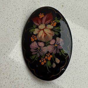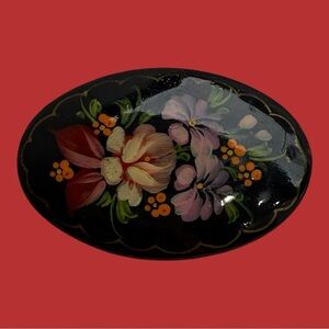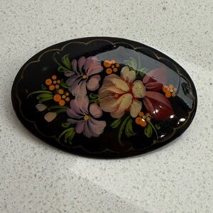 Vintage Brooch Pin Russian Hand Painted Lacquer Flowers Floral Oval