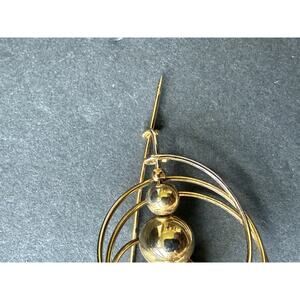 This vintage brooch pin features a unique wire-wrapped design in a gold tone, giving it an abstract deco art look. The piece exudes a mid-century modern artsy vibe, perfect for adding a touch of vintage charm to any outfit. Made with a gold base metal, this fashion jewelry item is a statement piece that will effortlessly elevate your look with its retro appeal.