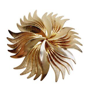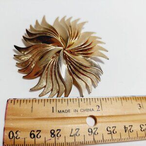 This vintage brooch showcases an elegant pinwheel design with a starburst effect in a gold tone. Measuring 2.5 inches, it captures the nostalgic charm of a bygone era. Its unique design adds a touch of sophistication to any collection, reflecting the artistry and craftsmanship of vintage accessories.