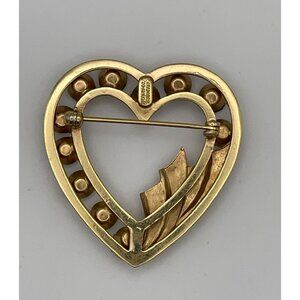 Vintage brooch with 12K yellow gold-filled heart and clear prong-set rhinestones. Signed by Catamore, this elegant piece adds a timeless touch to any outfit.