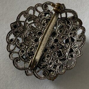 Vintage Brooch Silver Tone Pin Rhinestones Domed Filagree