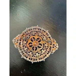Found this gem in an antique store about 35-40 years ago. Large piece of antique brass metal color with clear stones probably rhinestones. There are many missing ones scattered throughout. Pin on back works fine.