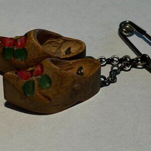 The Brooch consists of a large safety pin from which two small, hand-painted wooden clogs dangle via chains.
