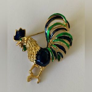 Vintage Brooch Enamel Rooster Gold Rhinestone