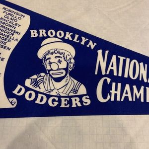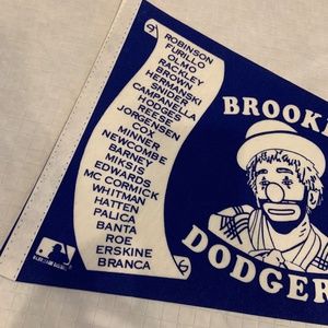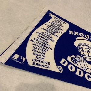 Featuring baseball superstars including: Jackie Robinson, Carl Furillo, Duke Snider, Pee Wee Reese, Gil Hodges, Roy Campanella, Don Newcombe, Clem Labine, Preacher Roe, Carl Erskine, Ralph Branca, and many more influential players, this pennant flag is a true gem for any baseball fan.