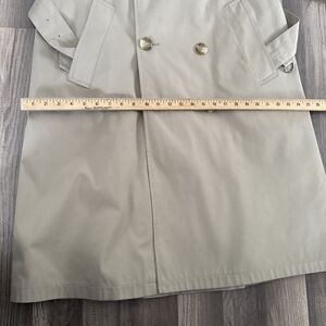 This vintage Brooks Brothers men's overcoat is made of Dacron polyester with a wool lining, making it a classic and stylish choice for travel, casual, or business occasions. The long coat features a solid beige color, button closure, and various accents such as straps, buckles, and zippers. With a timeless trench coat style, this United States-made piece also includes features like being lined, collared, and water resistant, making it a versatile and practical option for the winter, fall, and spring seasons.
