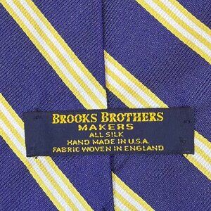 Classic Brooks Brothers tie in refined silk fabric. Features navy and yellow striped pattern, handmade in the USA with premium material woven in England.