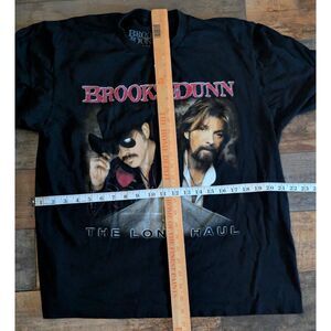 Step back in time to the golden era of country music with this authentic Brooks & Dunn "The Long Haul" 2006 Tour T-shirt! The moment you see the iconic duo, Ronnie Dunn and Kix Brooks, emblazoned on the front, you'll feel a rush of nostalgia for their legendary hits and unforgettable concerts. This isn't just a shirt; it's a piece of history, a memento from a tour that brought joy to countless fans. Notice the classic black cotton fabric, ready to become your next favorite comfortable tee, perfect for everyday wear or your next country concert. The back features a comprehensive list of tour dates, making it a true collector's item and a fantastic conversation starter. You're already picturing yourself rocking this vintage find, feeling connected to the roots of country music and turning heads with its authentic vibe. This shirt has a way of making you feel part of something special, inviting you to relive those incredible memories. Don't let this piece of country music heritage ride off into the sunset without you!
