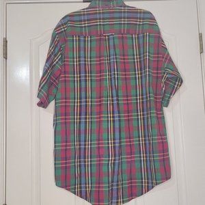The shirt also has some great accents, including pockets, and is perfect for any outdoor activity. It is machine washable and has a fabric type of woven. This shirt is a size L and is perfect for any man looking to add a touch of 80s style to their wardrobe.