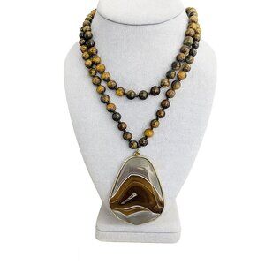 Vintage Brown Agate & Tiger's Eye Beaded Long Pendant Necklace 34"