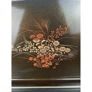 This Vintage Brown and Black Lacquer Serving Tray with plastic wrapped handles is a stylish and practical addition to any home. The square-shaped tray features a glossy black finish with a unique daisy theme, adding a touch of elegance to your table setting. With dimensions of 19 inches in length and 11 inches in width, this large serving tray is perfect for all occasions, making it a versatile piece for your dining or entertaining collection.