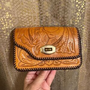 Vintage 50's Brown Boho Hand Tooled Leather Mini Satchel Purse Without A Strap