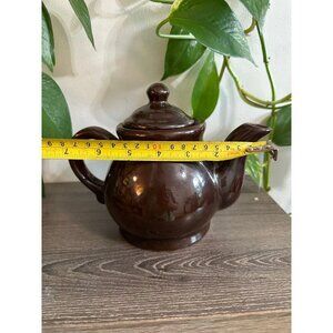 Charming vintage brown ceramic teapot with a classic rounded shape and matching lid. Glossy finish and sturdy handle, perfect for display or everyday tea service.