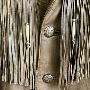 Stylish leather jacket with fringe details. Features decorative patches and button closure. Perfect for a bold look.